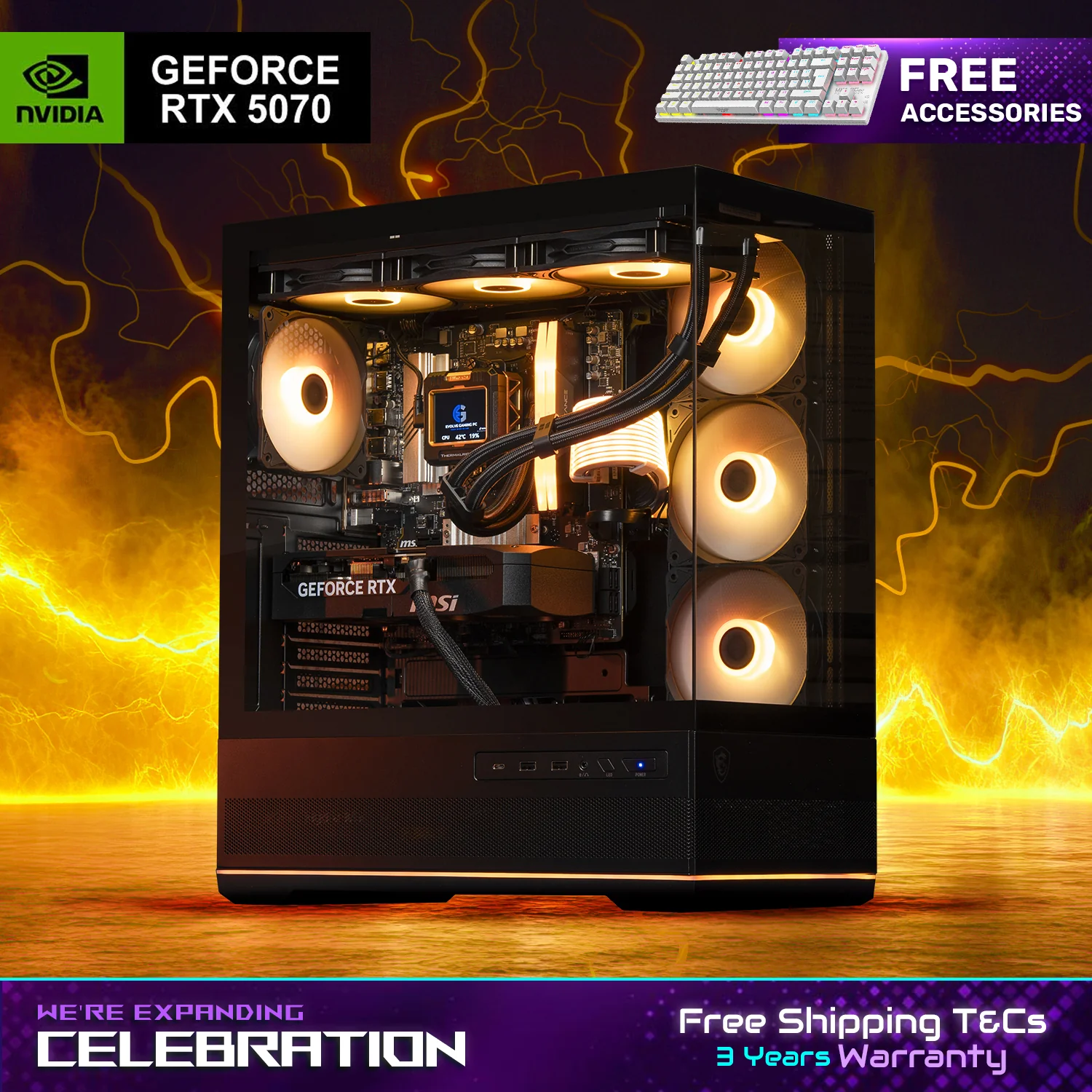 This custom gaming PC doesn’t just perform — it looks incredible too. The Brimstone comes equipped with a 360mm liquid cooler to keep temperatures low and performance stable, even during long gaming sessions. Its LCD display can be fully customized to showcase your favorite gaming logos, animations, or GIFs, turning your PC into a true reflection of your personality. On top of that, the new GlowLink 24-pin RGB cable is included, adding a professional custom-build look straight out of the box. With preinstalled lighting software, you can easily change the entire system to any color scheme you want, making the Brimstone one of the most customizable prebuilt gaming PCs available.