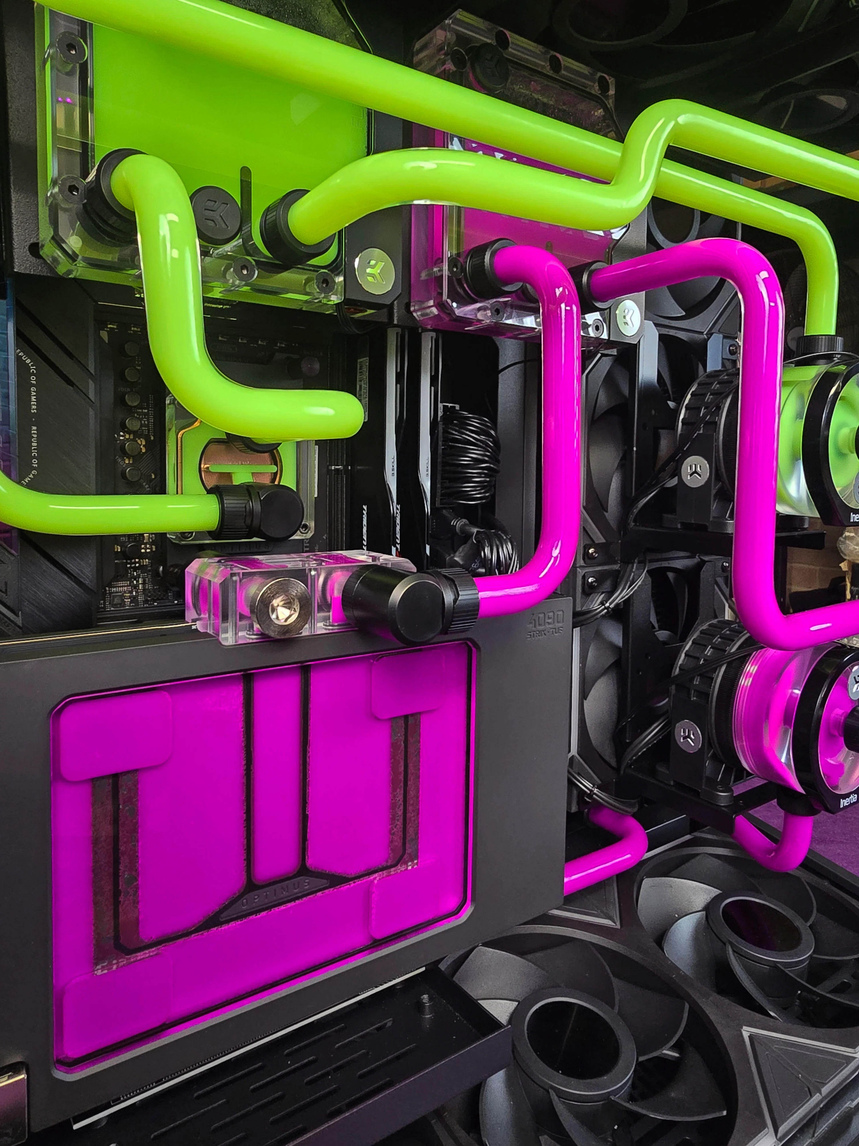 Inside, a symphony of emerald green and royal purple coolant flows through a dual-loop system, each vibrant hue dancing gracefully through the intricate network of cooling tubes. The gentle hum of the pumps echoes softly, a testament to the precision engineering that keeps our rig running smoothly even under the most intense gaming sessions.