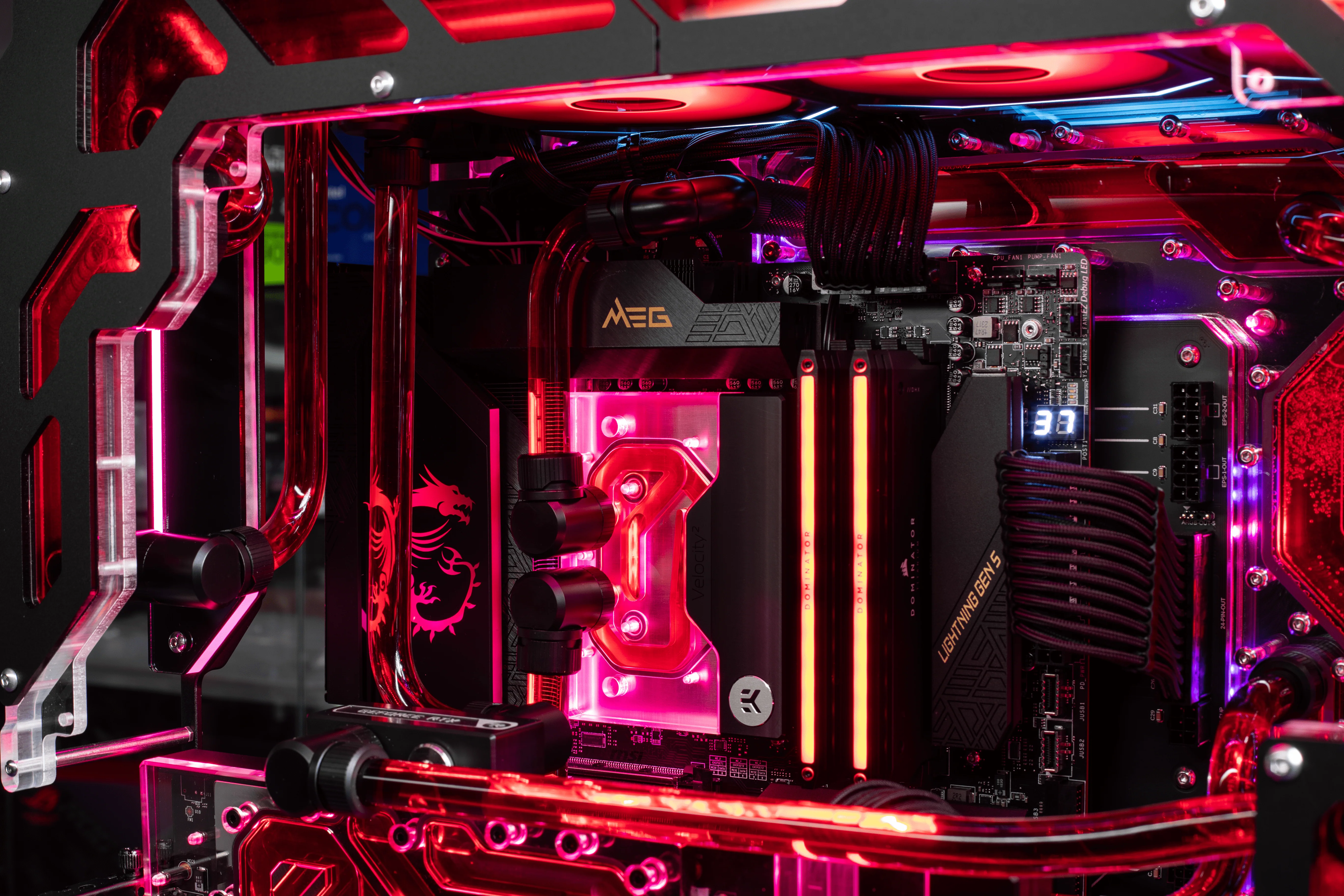 Zeus offering only the best watercooling components featuring within the Singularity case completely custom fabricated acting as an entire distro plate for maximum amount of water volume for whatever is thrown at this godly build.